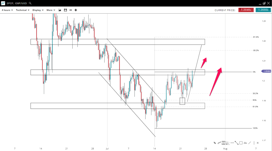 The price of GBP/USD successfully broke above a bearish channel after a V-bottom near the 1.18 mark. The price is in a consolidation phase under the 1.20 mark where the price found more buyers near the 50% fibonacci retracement. If the market breaks the pivot level to the upside, this could lead to a move higher toward 1.22. Otherwise if the Pound fails to break the 1.20 mark, it could take the price back to the 1.18 level.