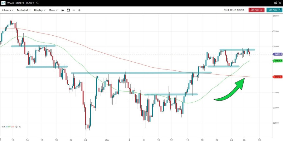 The price has been trending higher since breaking above resistance at 34,100 but has more recently traded sideways between 34,350 and 34,900.