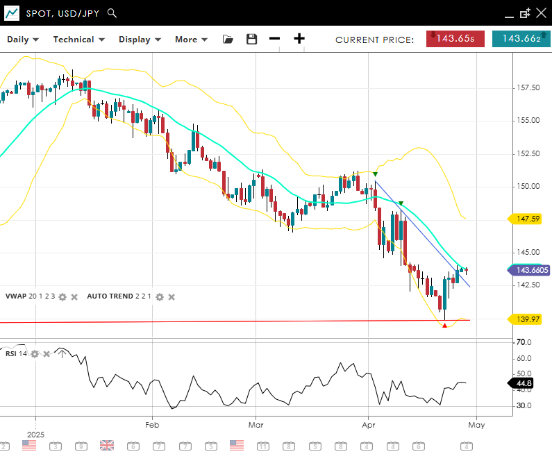 USD/JPY remains in a bearish trend and is currently in a correction phase. It trades at 143.66, aligned with its VWAP of 143.70. The RSI stands at 44.8, suggesting momentum remains soft. Support is identified at 139.97, while resistance is at 147.59.
