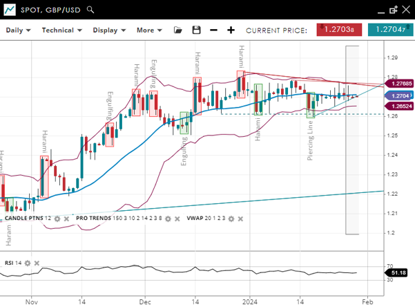GBP/USD presents a neutral trend, hovering around the 20-period VWAP of 1.2708. The support and resistance levels are closely set at 1.2652 and 1.2768, respectively. The RSI is at 51, indicating a balanced market condition, suggesting uncertainty and lack of a clear directional trend.