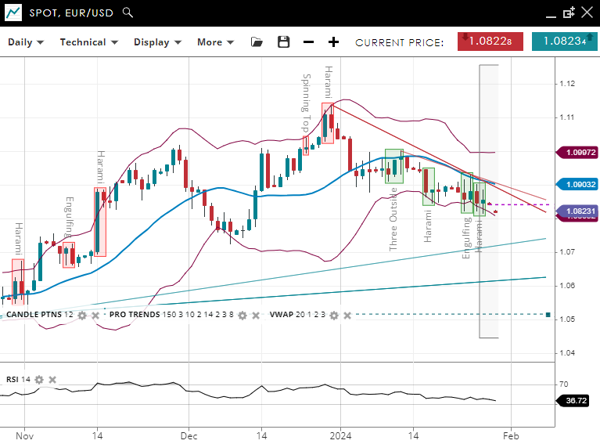 EUR/USD is showing a bearish trend, with the price below the 20-period VWAP of 1.0904. The support is found at 1.0813, and resistance is at 1.0995. The RSI at 39 indicates a lack of strong momentum but leans towards a bearish bias.