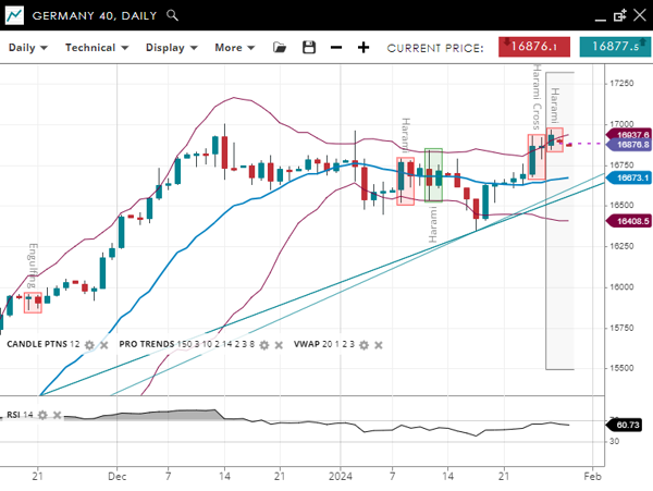 Germany 40 is in the impulse phase of a bullish trend, with its current price positioning above the 20-period VWAP of 16,673. The index finds its support at 16,404 and faces resistance near 16,942. The RSI stands at 62, indicating a strong upward momentum.