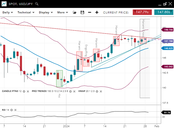 USD/JPY is in the impulsive phase of a bullish trend, with its price above the 20-period VWAP of 146.64. The support level is at 143.54, with resistance at 149.73. The RSI is at 63, suggesting strong bullish momentum, indicating the potential for continued upward movement.