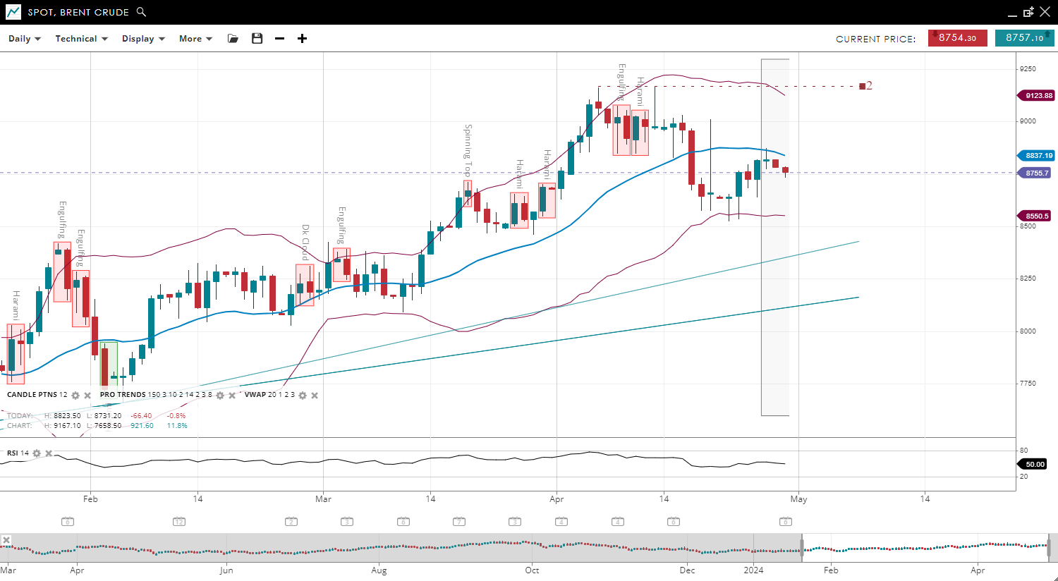 Brent Crude has switched from a bullish to a bearish trend and entered an impulsive phase. The price has risen to 87.55, yet it remains below the VWAP of 88.37. Support and resistance levels have slightly adjusted to 85.50 and 91.23, respectively. The RSI has balanced to 50, marking a significant cooling of previous bullish momentum.