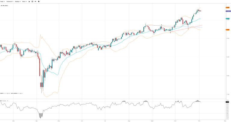 The UK 100 continues in a strong bullish impulsive trend, trading at 9,732 above its VWAP of 9,532. Momentum remains strong with an RSI of 69.3, nearing overbought territory. Support is seen at 9,234 and resistance at 9,829.