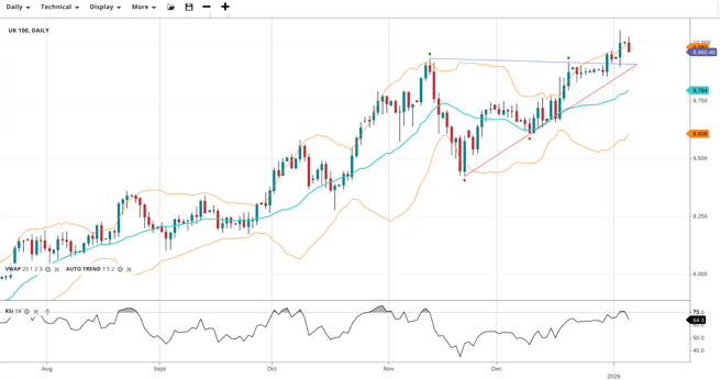 The UK 100 maintains its bullish trend and is breaking out from previous highs, currently trading at 9,960 above the VWAP of 9,794. RSI at 64.3 supports the upward momentum. Support is at 9,608 and resistance lies just ahead at 9,980.