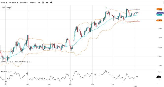 USD/JPY is in a bullish trend and continuing its impulsive move higher, trading at 156.73 above its VWAP of 156.28. RSI at 55.2 confirms steady momentum. Support is at 154.75, with resistance at 157.82.