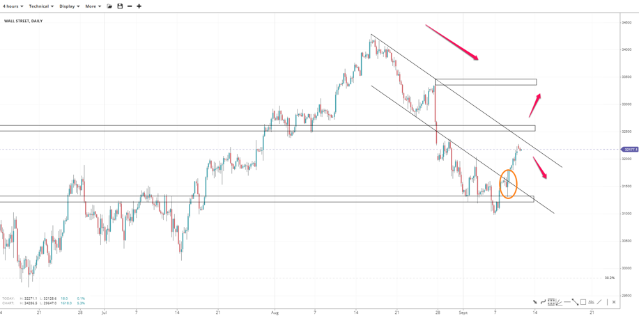 Wall Street tumbled outside the bearish channel in what seems to be an accelerated leg towards 29000. If support weakens there, 28000 is next, as round level. In case of a break above the 138.2 of 34300-31000 near 29730, bulls will eye 30500 above the 30000 handle, with a high at 31000.