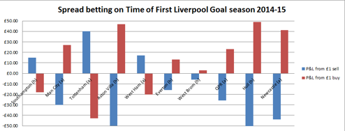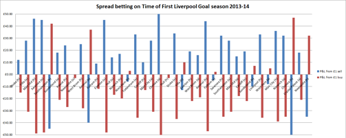 When it comes to spread betting on football, Liverpool were one of the most popular sides to bet on for punters last season as their games heralded goals galore.Liverpool’s fast start to matches last season often saw them blast their opponents away in the first quarter of matches and this meant for a particular interest in spread betters playing the Time of First Liverpool Goal market.This market is based on the spread betting companies putting out a spread or prediction on the time they think Liverpool will score their first goal in each game. Spread betters would sell on the prediction if they felt the goal would come earlier than the prediction, or buy if they felt it would come later than predicted, or if they felt Liverpool would not score at all (when the market makes up at 90). So, for example, if Spreadex predicted Liverpool’s first goal in a match to come between the 46th and 49th minutes of a match and you sold at £1 a point at 46, you would make £30 profit if Liverpool scored in the 16th minute (46 – 16). However if Liverpool scored their first goal late on in the match in the 86th minute, that bet would lose £40 (46 – 86).Last season, if punters had placed a £1 sell of Time of First Liverpool Goal on every Reds Premier League match throughout the season, it would have resulted in profits of £518.For everyone who put a £1 buy of Time of First Liverpool Goal on every Reds Premier League match, it would have resulted in losses of £632.The profit and loss from each bet per match last season is shown below (click image to enlarge). However, moving on to this season and it has been the opposite story. For anyone placing a £1 sell of Time of First Liverpool Goal for each of the 10 Premier League matches so far, those bets would have resulted in losses of £152.While anyone placing a £1 buy of Time of First Liverpool Goal for each of the 10 Premier League matches so far would have made profits of £122, as shown below (click image to enlarge).