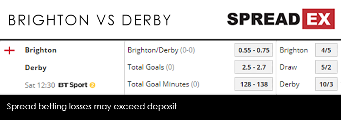 Saturday’s starter sees Brighton host Derby at 12.30pm on BT Sport 2. While the Seagulls have been dire in the league, picking up one win in their last 11 games, they’ve fought their way in the 5th round, a comfortable 3-1 win at Bournemouth followed by an extra time victory in their replay at West Brom. Derby, currently chasing a place in the Championship play-offs, knocked out Southampton on penalties before scraping past Accrington Stanley. The hosts, then, have the edge at a Brighton/Derby Goal Supremacy spread of 0.55-0.75.