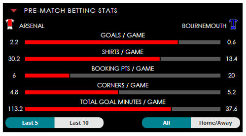 To see all the Arsenal v Bournemouth betting stats and form, visit our pricing page to view our Pre-Match betting stats table or hover over/tap the chart image to see previous outcomes for that particular market.