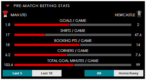 To see all the Man Utd v Newcastle betting stats and form, visit our pricing page to view our Pre-Match betting stats table or hover over/tap the chart image to see previous outcomes for that particular market.
