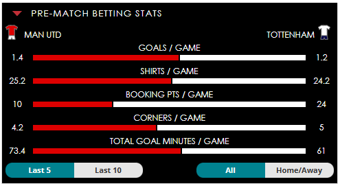 To see all the Man Utd v Tottenham betting stats and form, visit our pricing page to view our Pre-Match betting stats table or hover over/tap the chart image to see previous outcomes for that particular market.