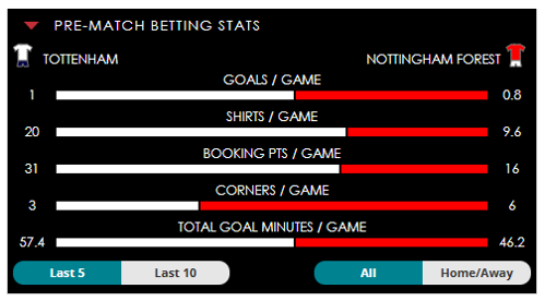 To see all the Tottenham v Nottingham Forest betting stats and form, visit our pricing page to view our Pre-Match betting stats table or hover over/tap the chart image to see previous outcomes for that particular market.